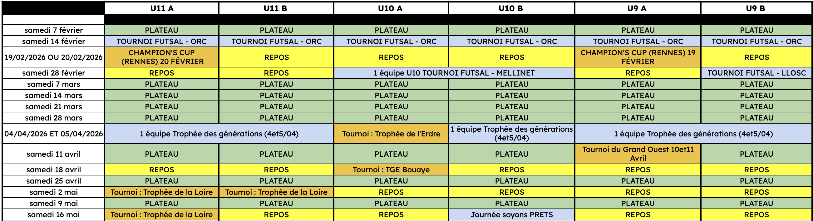 Groupe Vert (U10/U11) : 2ème entrainements le vendredi 17h45 à 19h00 / Mercredi 15H45 – 17H45 → Vestiaire n°3 entrainement sur le terrain synthétique.
